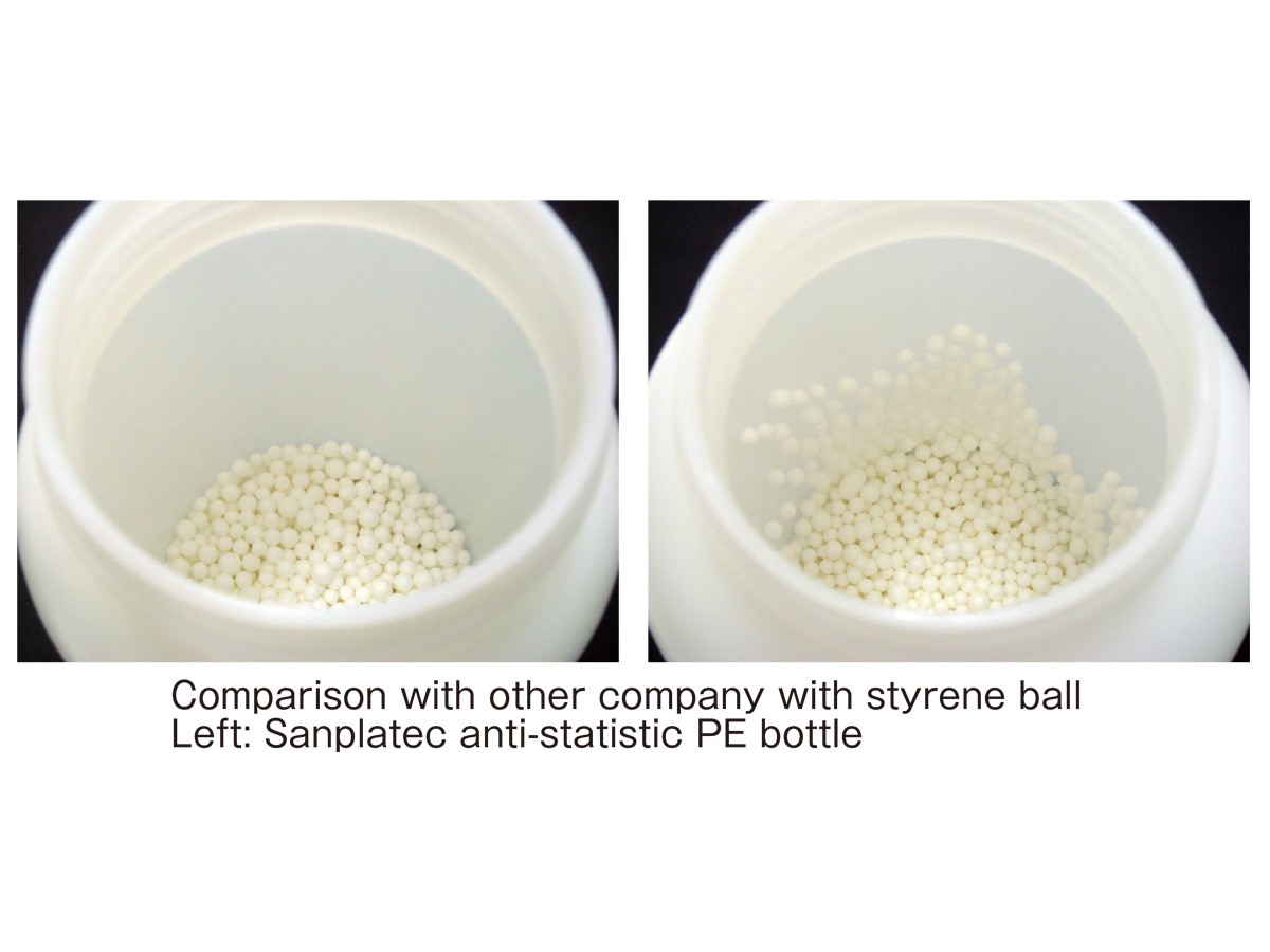 ●The electrical resistance of an antistatic PE bottle is approximately1×10⁸~1×10¹¹(Ω) compared to an ordinary plastic bottle that is easily charged (electrical resistance value is approximately 1×10^16Ω).